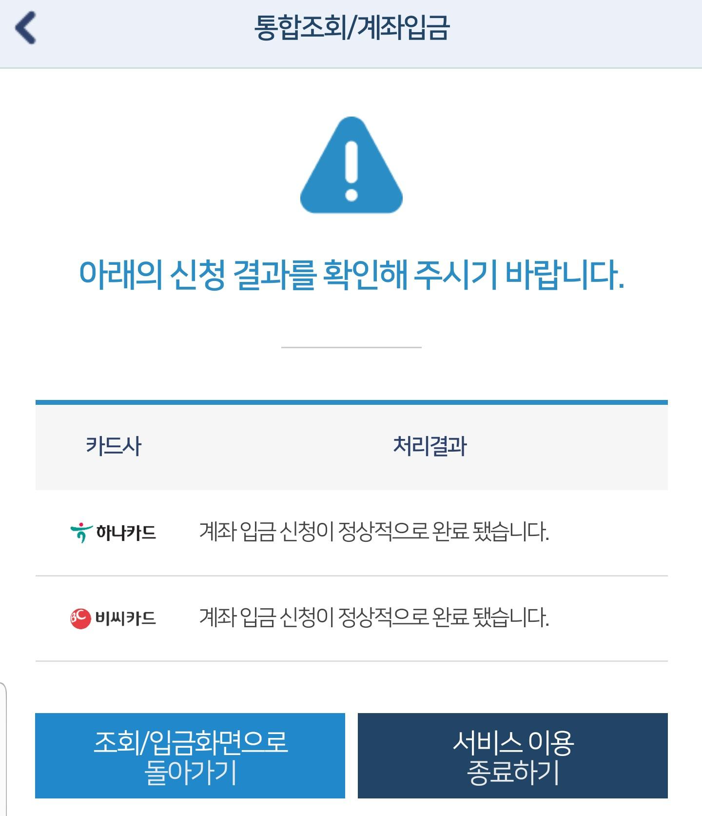 아래와 같이 화면이 뜨면 정상적으로 된 것이며 카드사에 따라 입금되는 시간이 차이가 있습니다.