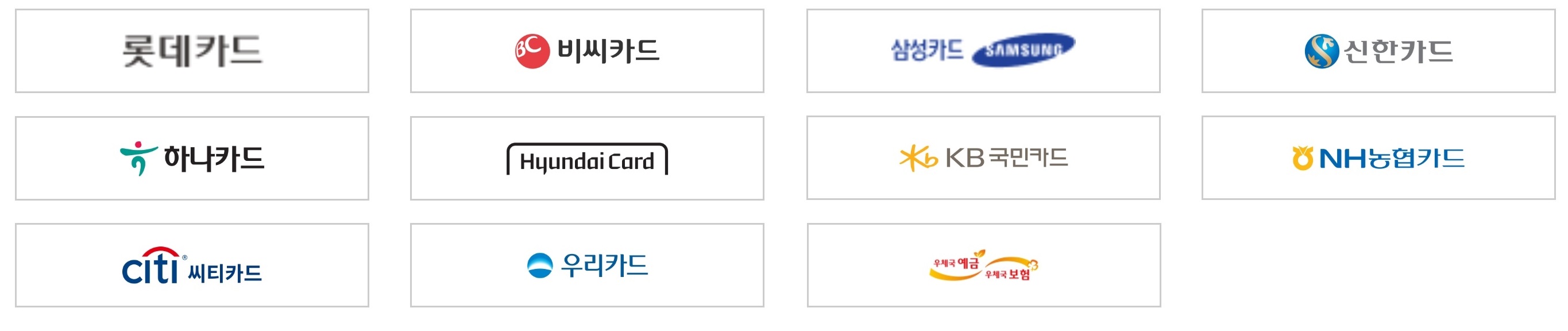 현재 2021년 11월 13일 기준 지원하는 카드사는 총 11군데이며, 지원하는 카드 회사는 아래와 같습니다.